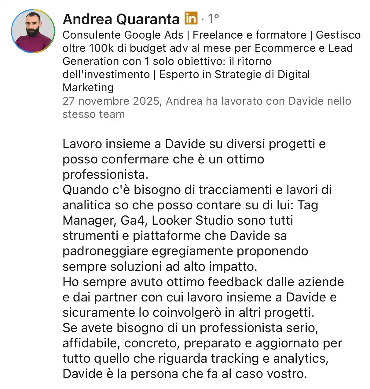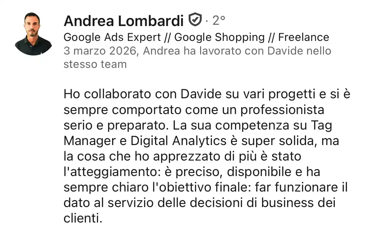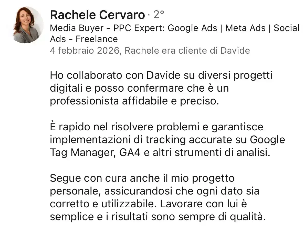Sono un Digital Analytics e Tracking Specialist orientato alla verità dei dati. Credo che i dati siano la voce dei tuoi clienti. Il mio lavoro è renderli chiari, affidabili e conformi al GDPR, così da permetterti di investire in advertising con maggiore sicurezza.