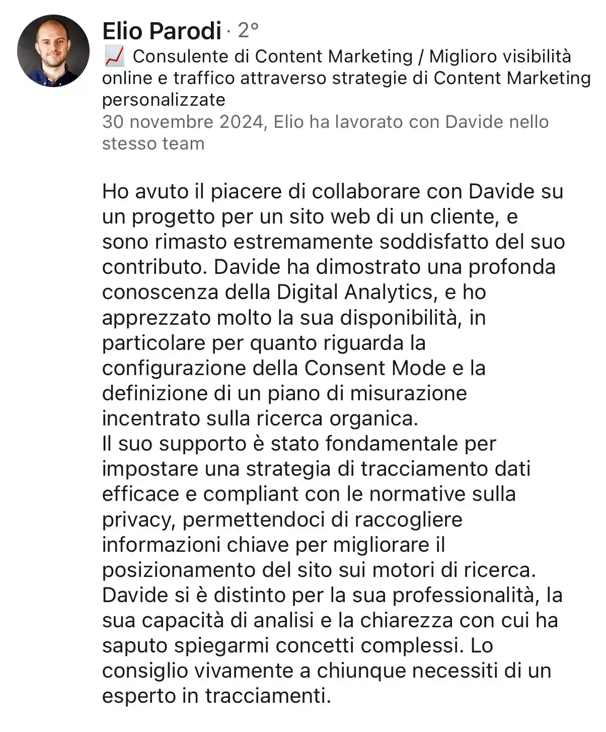 In un mercato in cui il tracciamento è spesso delegato a configurazioni automatiche, il mio approccio è artigianale e umano. Collaboro con aziende e agenzie che necessitano di uno specialista capace di integrarsi nei processi operativi, fornendo soluzioni strutturate, formazione e supporto continuo.